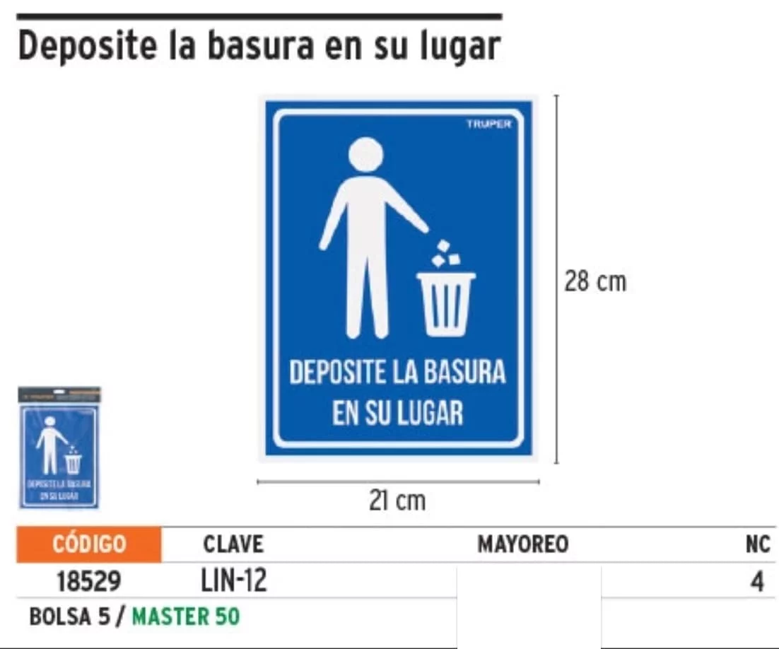 LETRERO DEPOSITE LA BASURA EN SU LUGAR 21X28 CM.