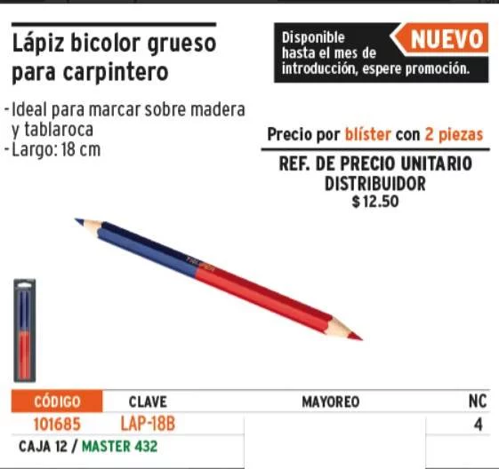 LAPIZ BICOLOR GRUESO PARA CARPINTERO, 18CM BLISTER