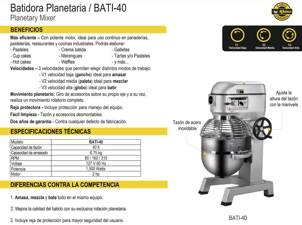 BATIDORA PLANETARIA 40L 9KG 3VEL 110V 1500W 2HP