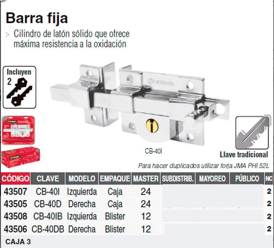 CERRADURA BARRA FIJA, DERECHA, LL/TRAD. EN CAJA