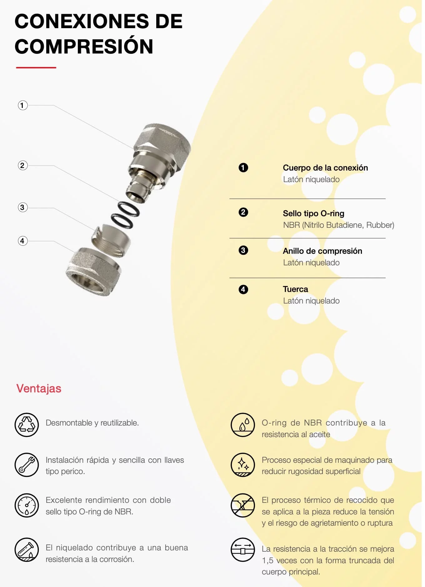• Conexión metálica con recubrimiento de níquel que evita la corrosión